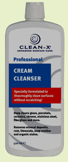 Propriété : Clean-X® Cream Cleanser convient idéalement pour le nettoyage des éviers, des baignoires, des douches, du mosaique, des vitres et toutes surfaces d'entretien difficiles.